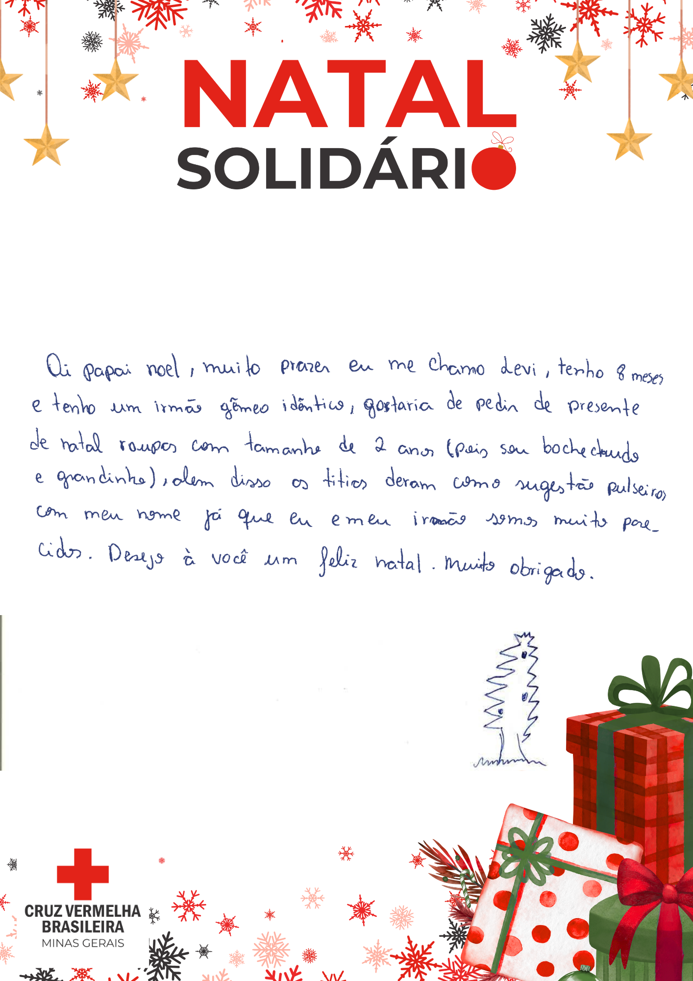 Oi Papai Noel, muito prazer eu me chamo Levi, tenho 8 meses e tenho um irmão gêmeo idêntico, gostaria de pedir de presente de natal roupas com tamanho de 2 anos (pois sou bochechudo e grandinho), além disso os titias deram como sugestão pulseiras com meu nome já que eu e meu irmão somos muito parecidos. Desejo a você um feliz natal muito obrigado.